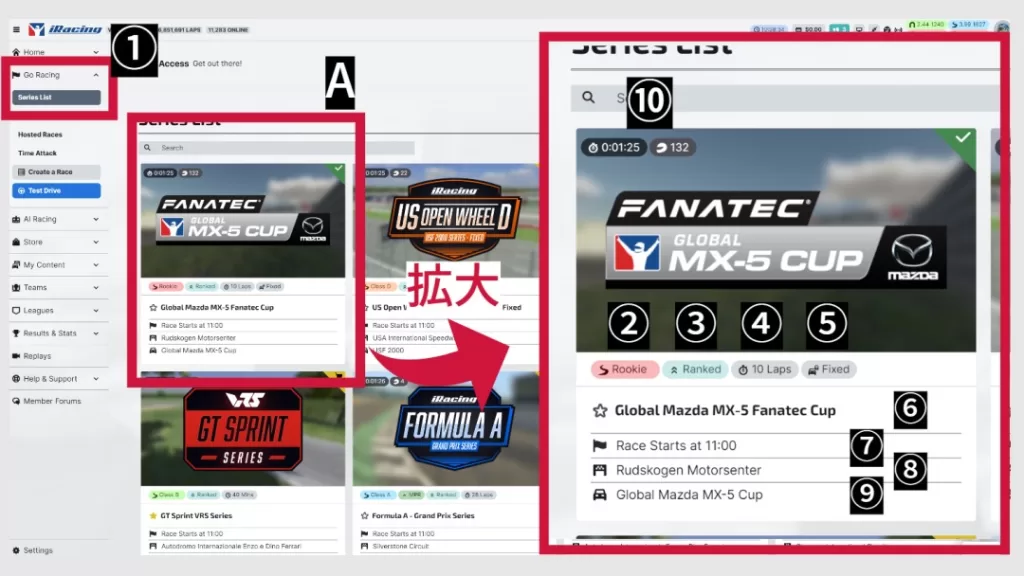 1. ”Go Racing”の中の”Series List”を選択することでこの画面が表示されます。初期では直近開催されるレースシリーズごとに上から表示