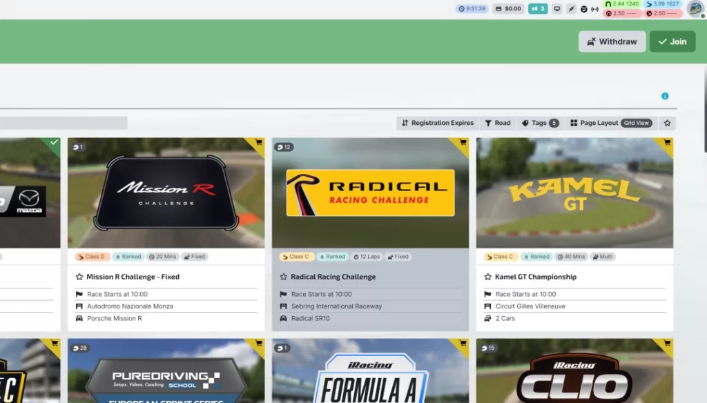 登録が完了すると画面右上に ”Withdraw” と “Join” のボタンが出てきますので、Join をクリックして入室しましょう。本番セッションの開始時間を過ぎている場合は、そのままレースセッションに切り替わり、まだ本番セッションが始まっていない場合はプラクティスセッションに切り替わります。