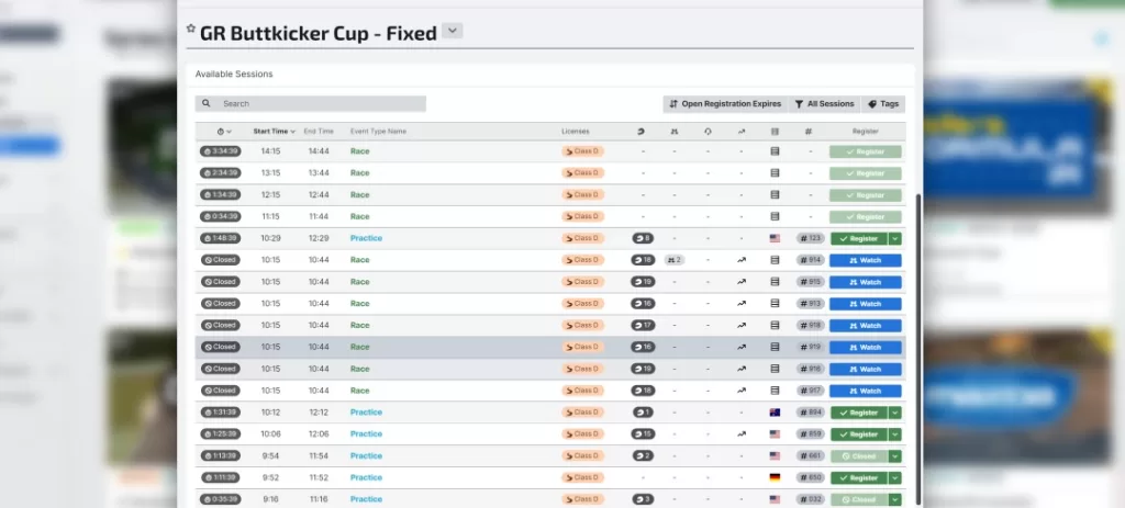 1. この行が直近行われるレースのタイムスケージュールになっています。一番左から、”登録〆切までのカウントダウン” → ”スタート時間” → ”おおよそのレース終了時間” → ”レースかプラクティスセッションかの表示” → ”対象ライセンス” → ”一番右:緑のボタンでレースへの参加登録が出来ます”