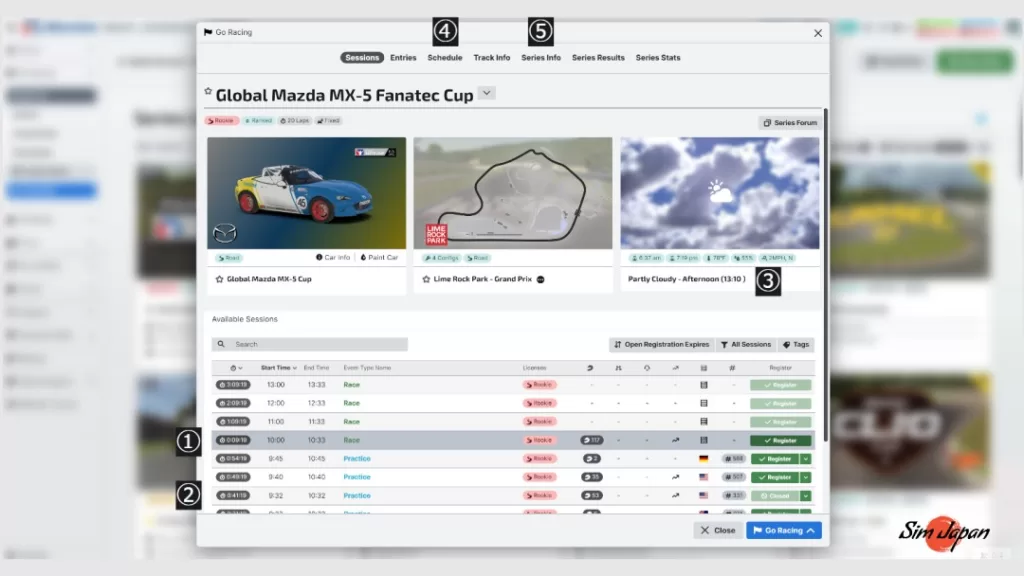 こちらは Rookieクラスの 「MX-5 FanatecCup」を選択した時に表示される画面です。ここからレースの詳細確認や、レースへの登録が出来るので見方を覚えておきましょう。
