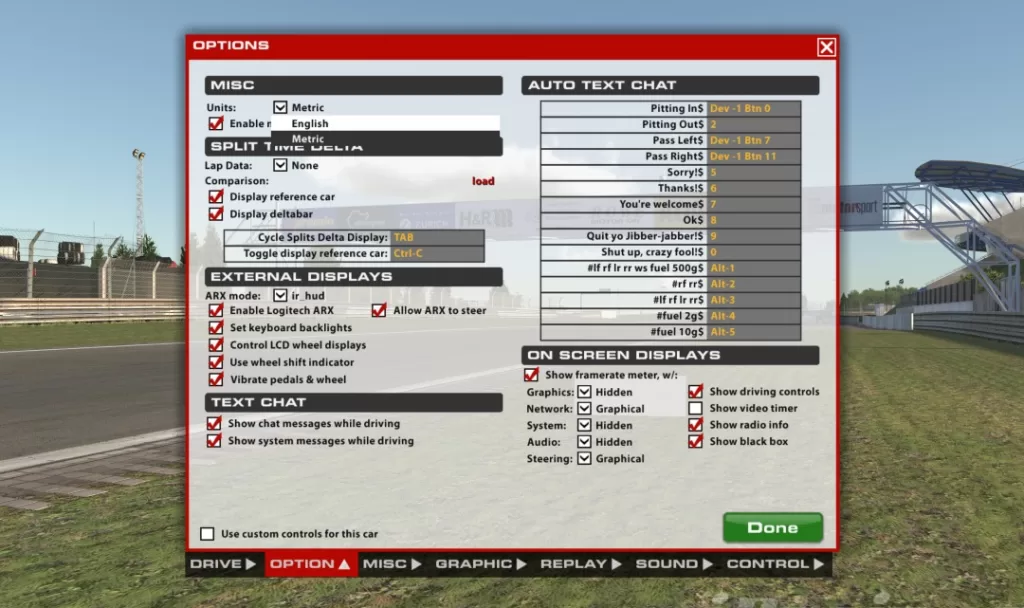 iRacing は全てが英語表記なので少し分かりづらいですが、細かいところまで設定できるので自分好みの、走りやすくて楽しい設定を見つけてみてください。