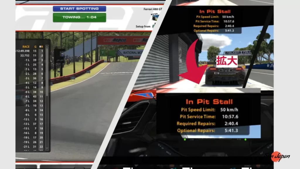 この TOWING 時間が0になるとピットでの作業が始まります。(TOWINGは自走してピットに戻るよりも時間がかかります。壊しても走れるなら頑張って自走しましょう)