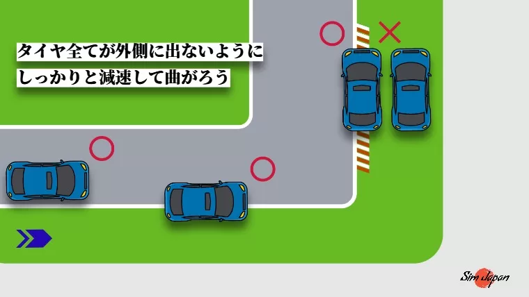 コースごとに種類はありますが、道の両端に白線が書かれているのでその中を走りましょう。白線のすぐ外側に縁石やグラベル(芝や砂)がありますが、ここは走路外。