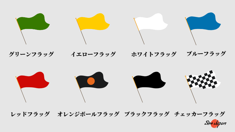 レースカテゴリーで若干の違いや、専用の旗色がありますが基本的な色のルールは同じなので覚えておきましょう。SIMソフトによっては若干の模様の違いや、システム上存在しない旗があることも注意。