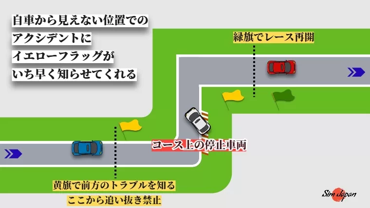 実際のレースでは減速し、コース上のアクシデントにすぐに対応できるよう準備をしなければいけませんが、SIMでは減速しなくてもペナルティは受けません。あくまでも”この先でなにかアクシデントがあるよ”という警告と、”オーバーテイク禁止だよ”の2種類の意味で使われます